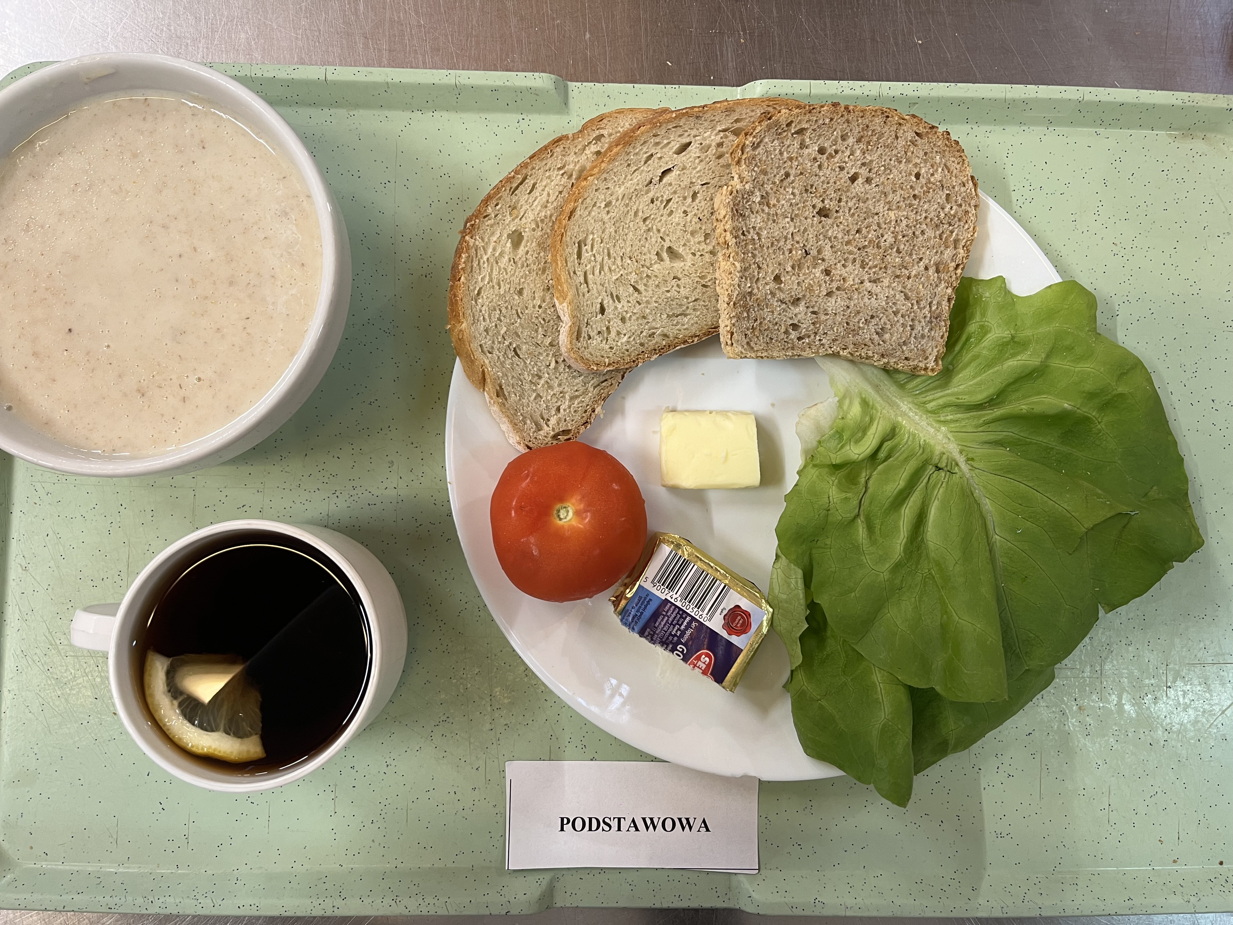 DIETA PODSTAWOWA Kasza manna na mleku 300 ml (GLU PSZ, MLE) Herbata czarna granulowana z/c 250 ml Chleb mieszany pszenno-żytni 150 g (GLU PSZ, GLU ŻYT) Chleb Graham 50 g (GLU PSZ) Masło extra 82% 15 g (MLE) Pasta z jaj z koperkiem dieta 80 g (JAJ, MLE) Sałata zielona 10 g |