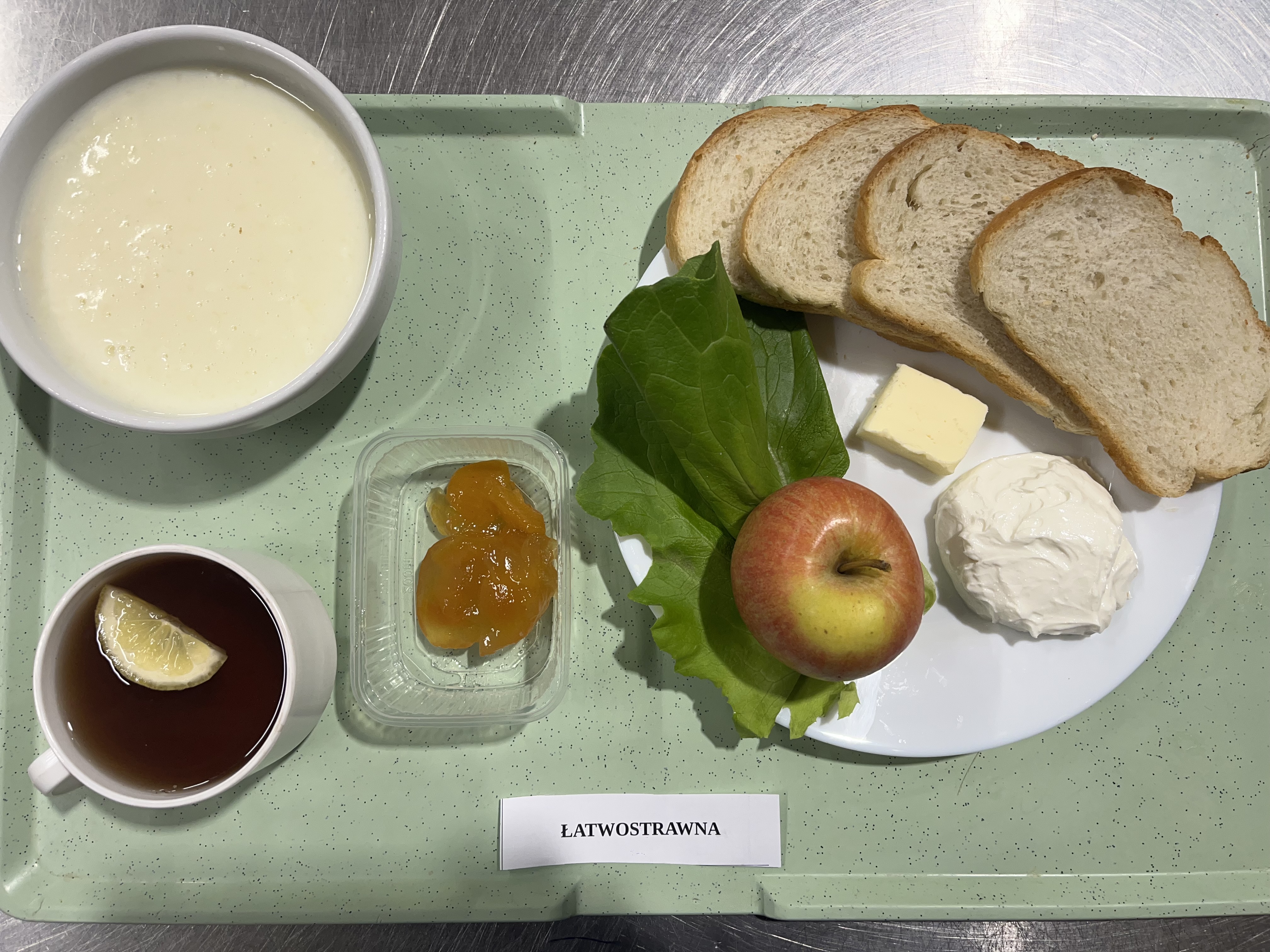 DIETA LEKKOSTRAWNA Herbata czarna granulowana z/c 300 ml Bułka pszenna długa krojona 150 g (GLU PSZ) Masło extra 82% 15 g (MLE) Filet królewski z indykiem produkt drobiowy z dodatkiem wieprzowiny średnio rozdrobniony parzony, wędzony 60 g (SOJ, może zawierać: GLU PSZ, JAJ, OZI, MLE, SEL, GOR, SEZ) Pomidor 80 g Kasza kukurydziana na mleku 300 ml (MLE) Sałata zielona 5 g |