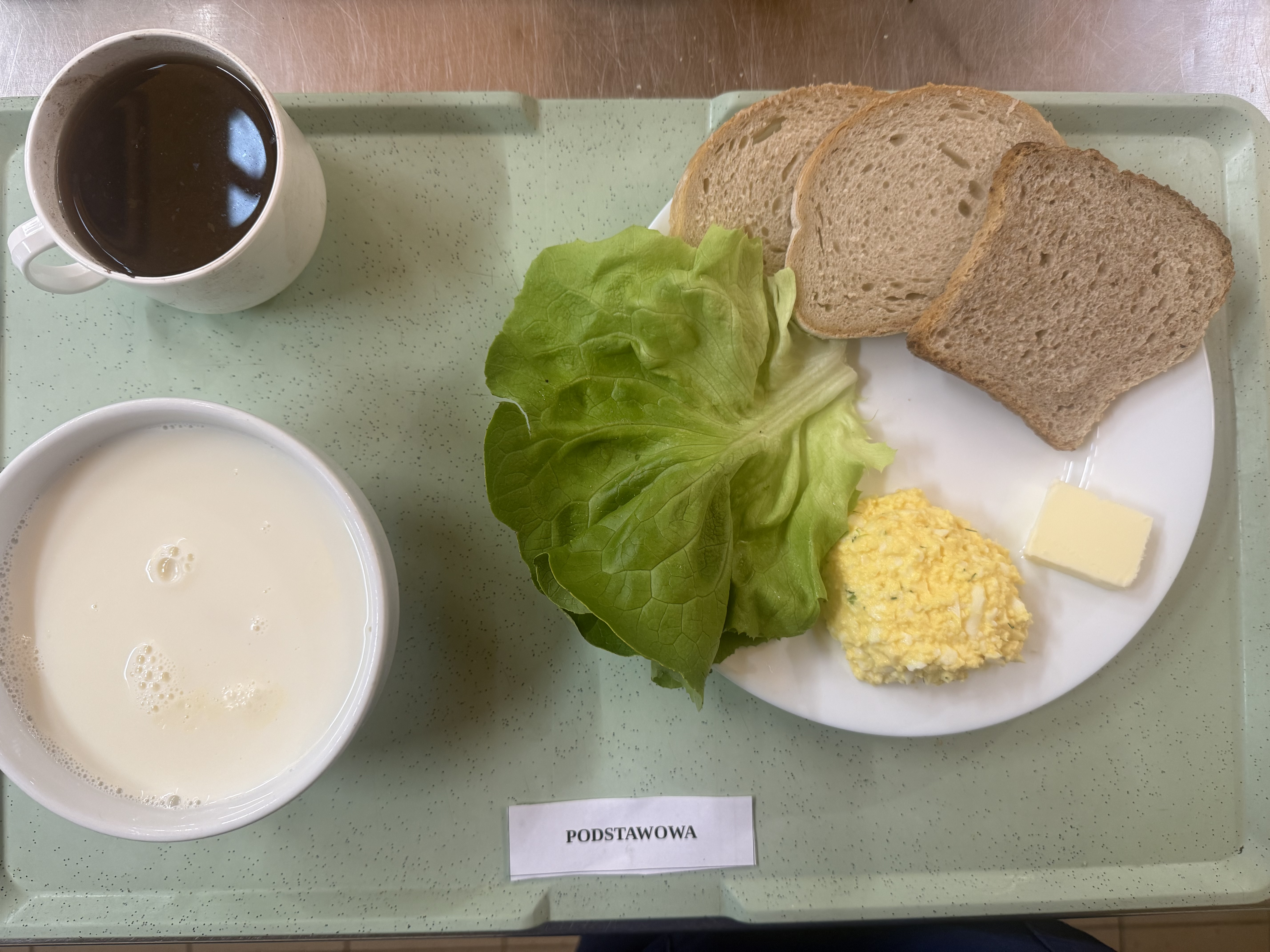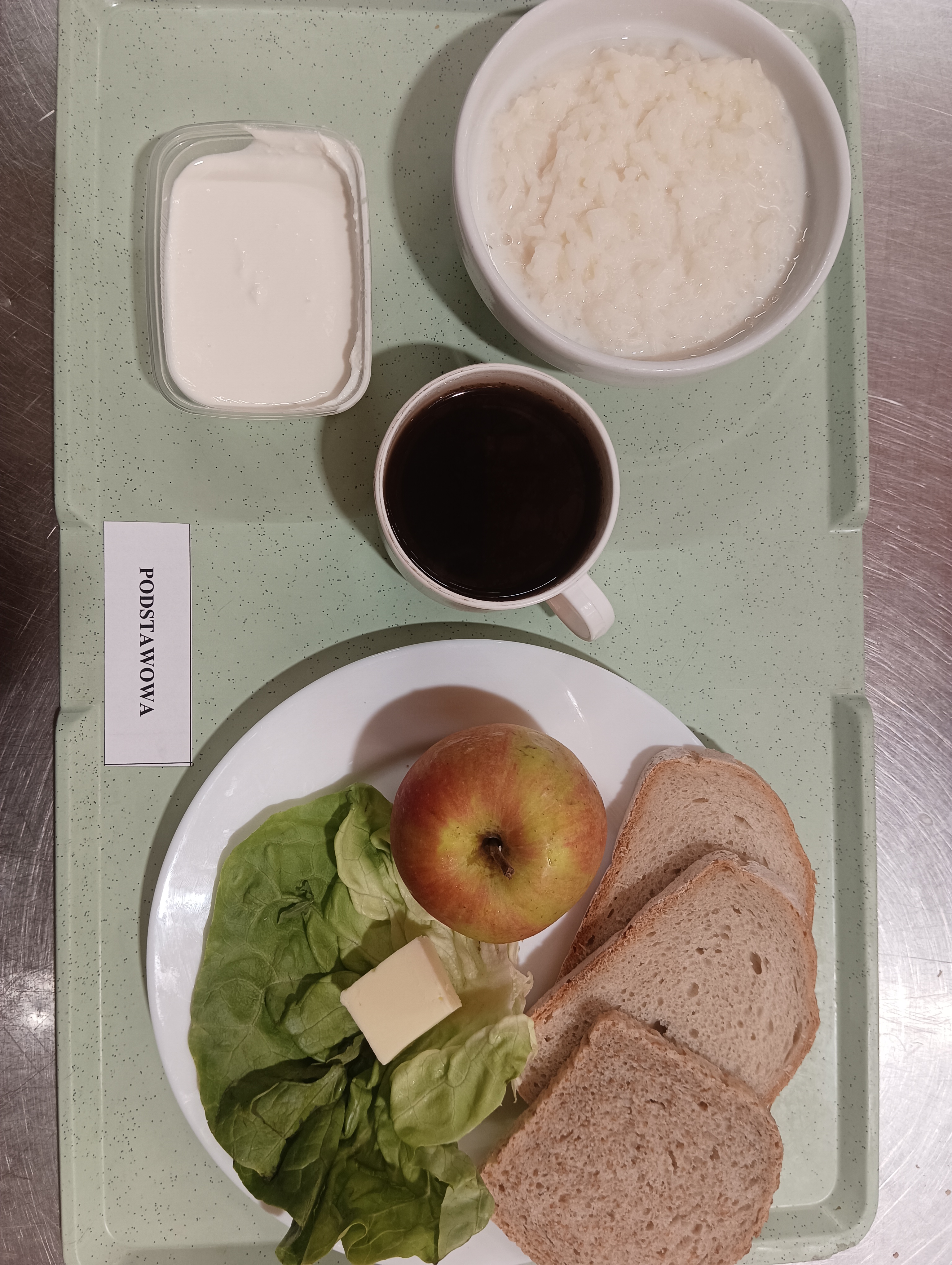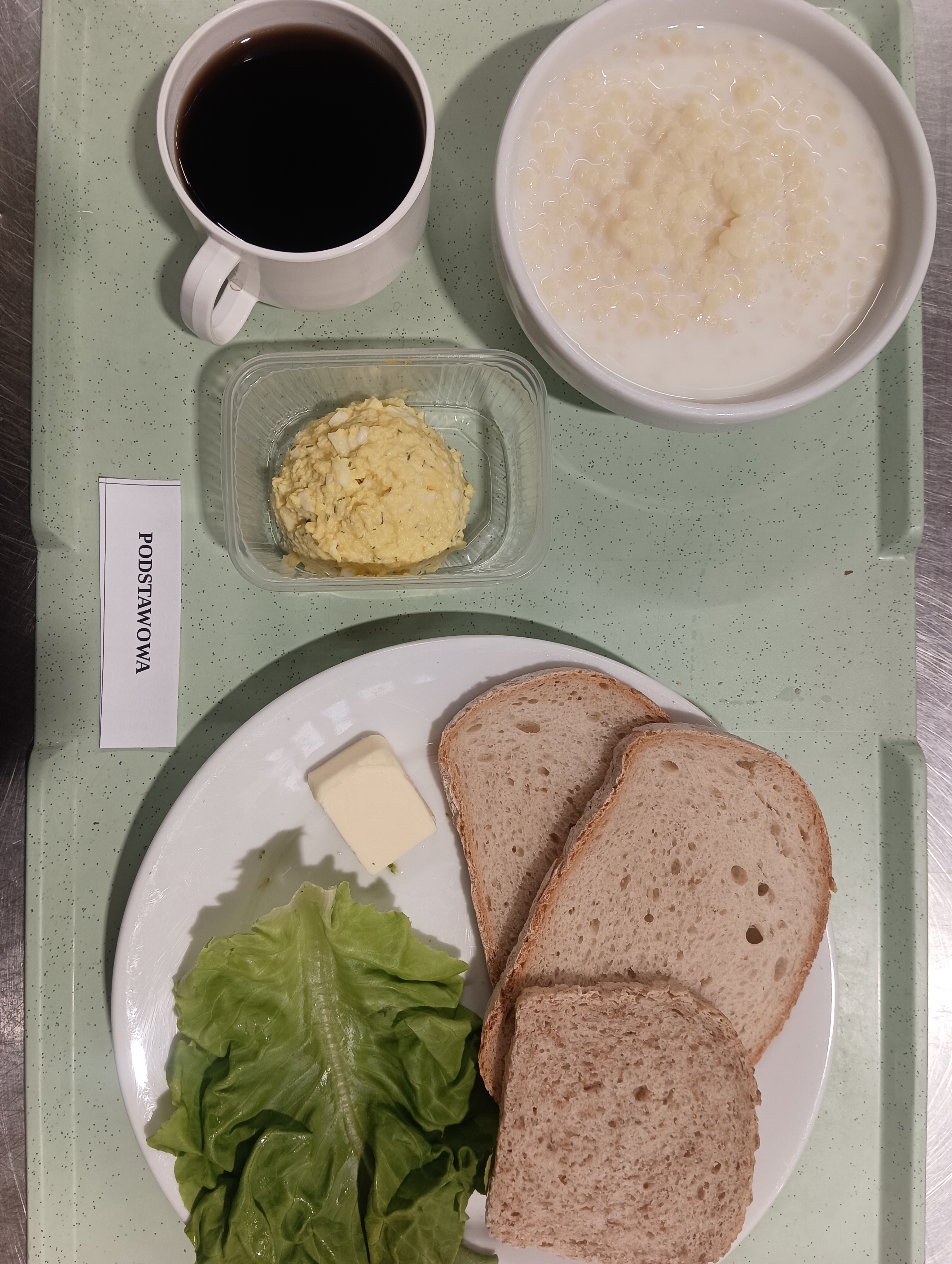 DIETA PODSTAWOWA Kasza manna na mleku 300 ml (GLU PSZ, MLE) Herbata czarna granulowana z/c 250 ml Chleb mieszany pszenno-żytni 150 g (GLU PSZ, GLU ŻYT) Chleb Graham 50 g (GLU PSZ) Masło extra 82% 15 g (MLE) Pasta z jaj z koperkiem dieta 80 g (JAJ, MLE) Sałata zielona 10 g |