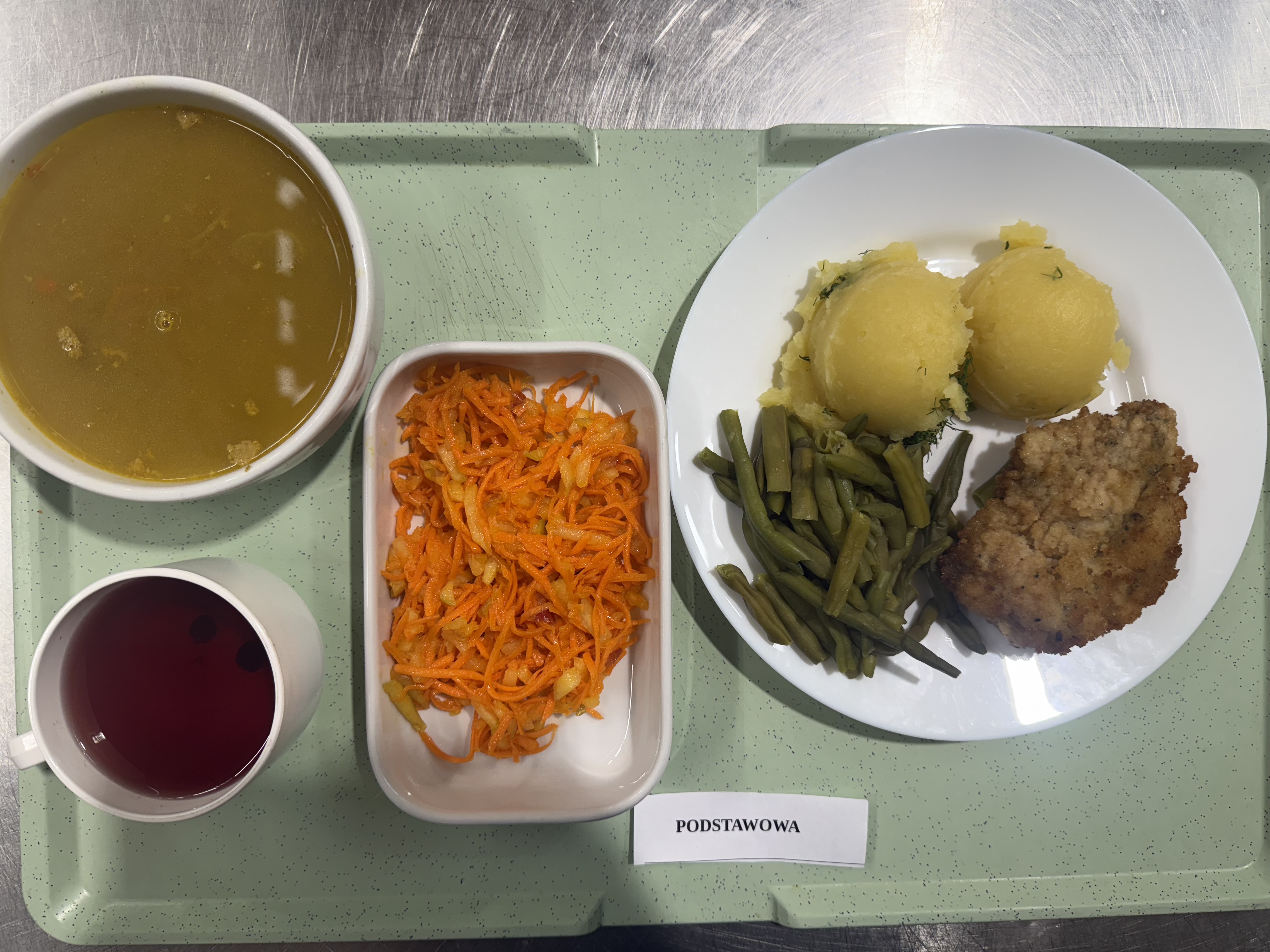 DIETA PODSTAWOWA Pieczarkowa z makaronem 350 ml (GLU PSZ, MLE, SEL, S02) Ziemniaki gotowane 250 g Kotlet drobiowy panierowany z udźca 70 g (GLU PSZ, JAJ) Surówka z marchwi i jabłka b/c 75 g (MLE) Fasolka szparagowa z wody 75 g Kompot owocowy z/c 300 ml |