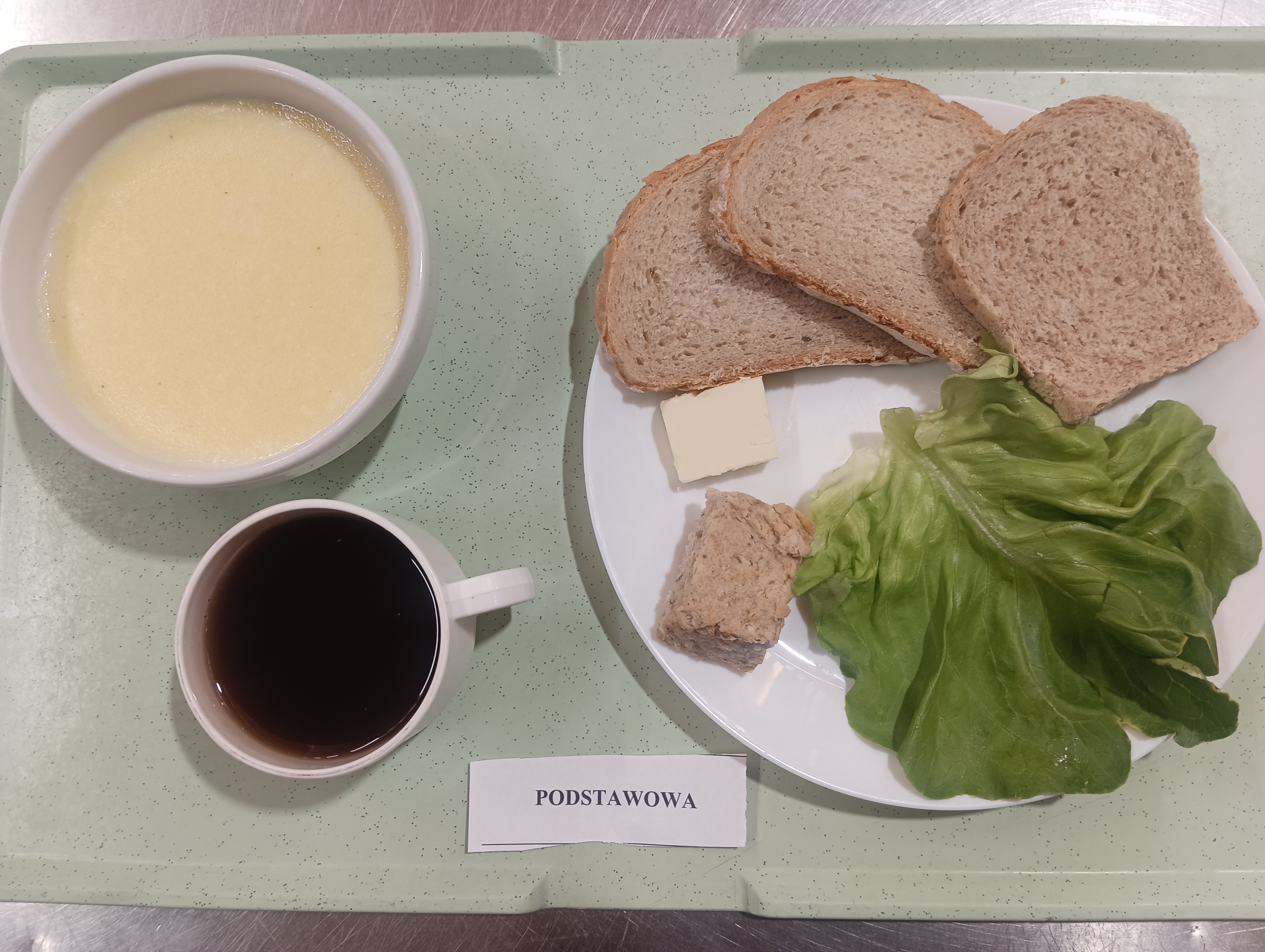 DIETA PODSTAWOWA Kasza kukurydziana na mleku 300 ml (MLE) Herbata czarna granulowana z/c 300 ml Chleb mieszany pszenno-żytni 150 g (GLU PSZ, GLU ŻYT) Chleb Graham 50 g (GLU PSZ) Masło extra 82% 15 g (MLE) Pasztet wieprzowy z warzywami 50 g (GLU PSZ, JAJ, SOJ, MLE, SEL) Sałata zielona 10 g |