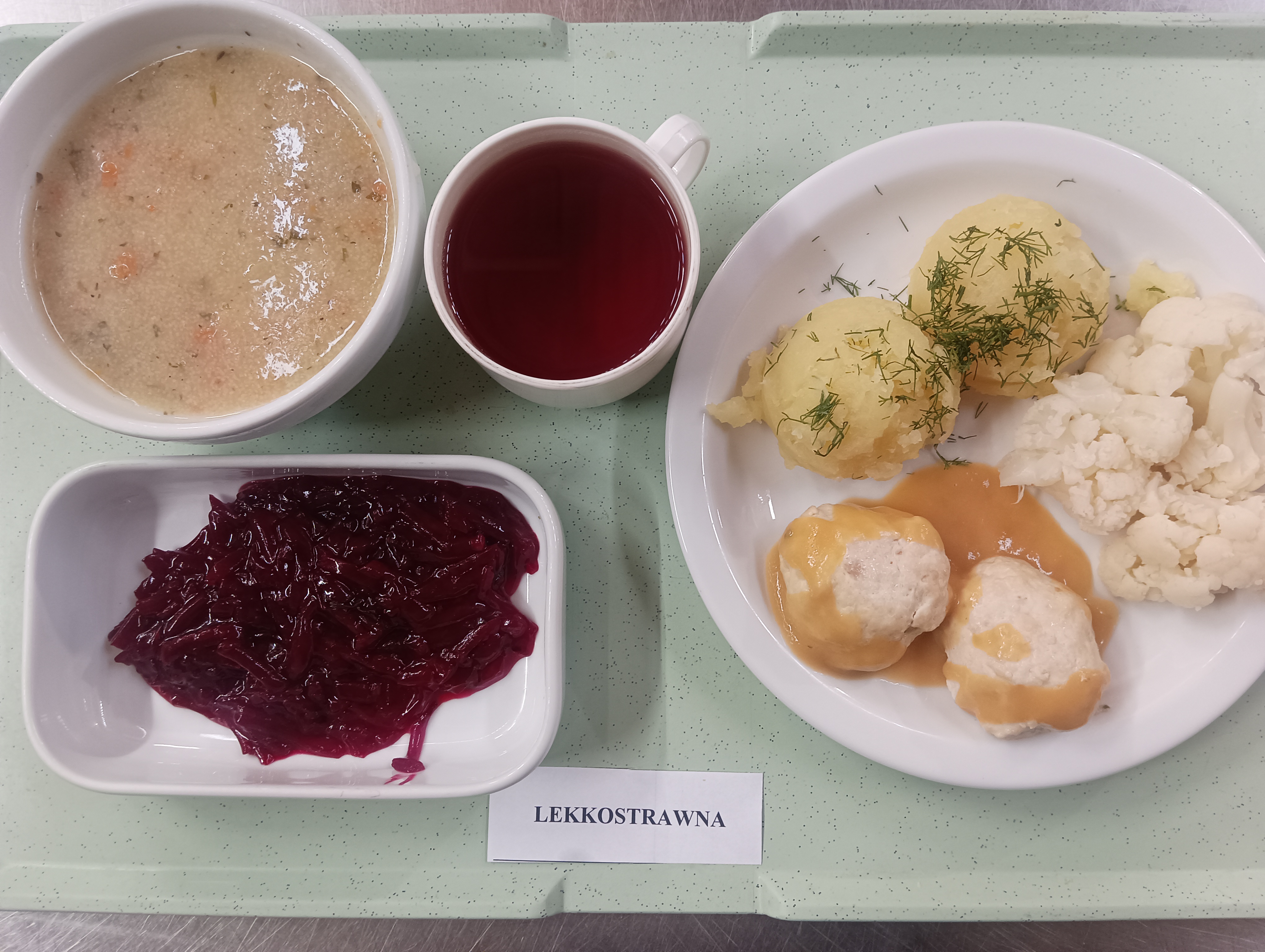 DIETA LEKKOSTRAWNA Zupa grysikowa 350 g (GLU PSZ, SOJ, SEL) Ziemniaki gotowane 250 g Pulpet z kurczaka 70 g (GLU PSZ, JAJ) Sos jarzynowy dieta 70 g (MLE) Buraki tarte na ciepło 75 g Kalafior gotowany 75 g Kompot owocowy z/c 300 ml |